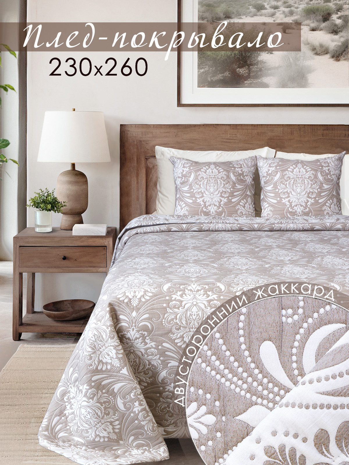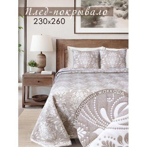 Покрывало с жаккардовым рисунком станет украшением любой спальни. Красивые универсальные цвета легко впишутся в интерьер спальни. Ненавязчивый рисунок, однотонный цвет - все это позволяет покрывалу дополнить интерьер спальни современным звучанием. Полиэстер в составе ткани делает покрывало долговечным и устойчивым к загрязнениям и истиранию, придает ткани благородный блеск. Хлопок - делает материал дышащим, гипоаллергенным, приятным на ощупь. Состав ткани: 20% Хлопок, 80% полиэстер. Плотность ткани: 340гр/м2. Изделие выполнено из трёхслойного жаккардового полотна, подгиб с евроуглом. Изнаночная сторона покрывала контрастного цвета с повторением рисунка лицевой стороны. Покрывало подойдет на двуспальную кровать с высоким матрасом и на кровать евро. Это покрывало - идеальный подарок любой женщине на Новый год или 8 Марта, на свадьбу, на новоселье или ко дню рождения. Покрывало подчеркнет вкус владельца и добавит интерьеру утонченность и изысканность. Привнесите уют и красоту в спальню с нашим покрывалом. Чтобы