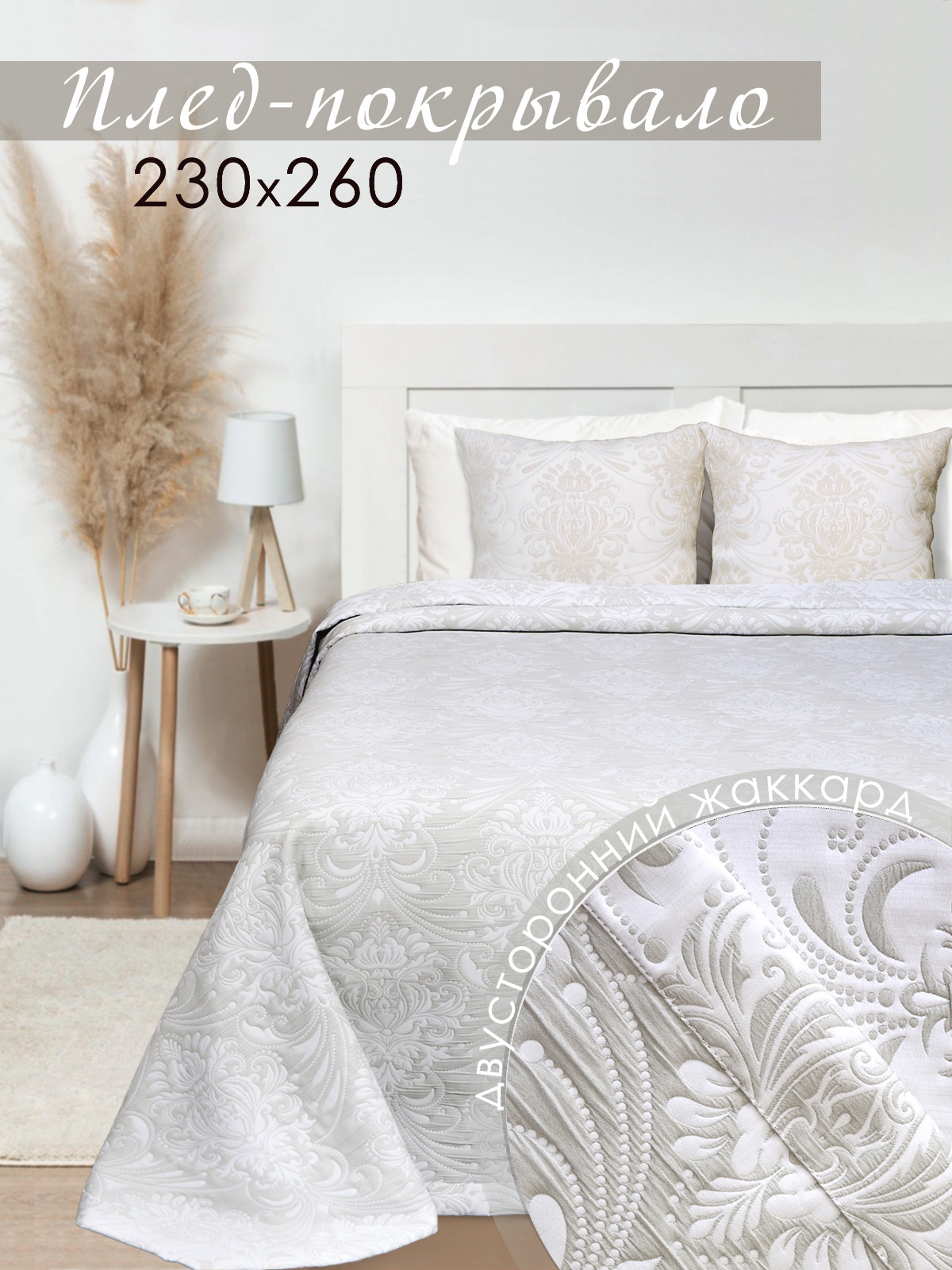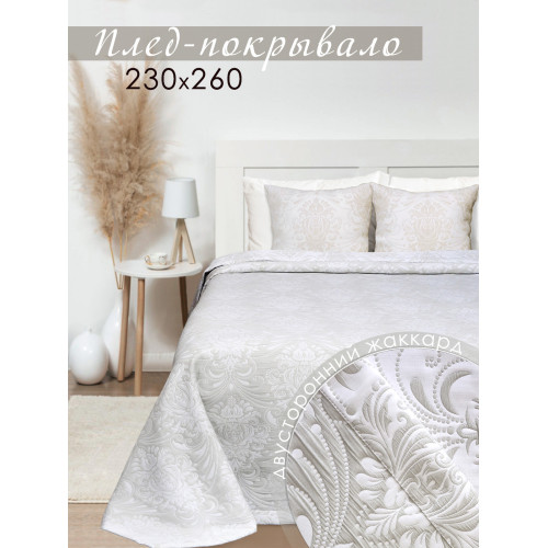 Покрывало с жаккардовым рисунком станет украшением любой спальни. Красивые универсальные цвета легко впишутся в интерьер спальни. Ненавязчивый рисунок, однотонный цвет - все это позволяет покрывалу дополнить интерьер спальни современным звучанием. Полиэстер в составе ткани делает покрывало долговечным и устойчивым к загрязнениям и истиранию, придает ткани благородный блеск. Хлопок - делает материал дышащим, гипоаллергенным, приятным на ощупь. Состав ткани: 20% Хлопок, 80% полиэстер. Плотность ткани: 340гр/м2. Изделие выполнено из трёхслойного жаккардового полотна, подгиб с евроуглом. Изнаночная сторона покрывала контрастного цвета с повторением рисунка лицевой стороны. Покрывало подойдет на двуспальную кровать с высоким матрасом и на кровать евро. Это покрывало - идеальный подарок любой женщине на Новый год или 8 Марта, на свадьбу, на новоселье или ко дню рождения. Покрывало подчеркнет вкус владельца и добавит интерьеру утонченность и изысканность. Привнесите уют и красоту в спальню с нашим покрывалом. Чтобы