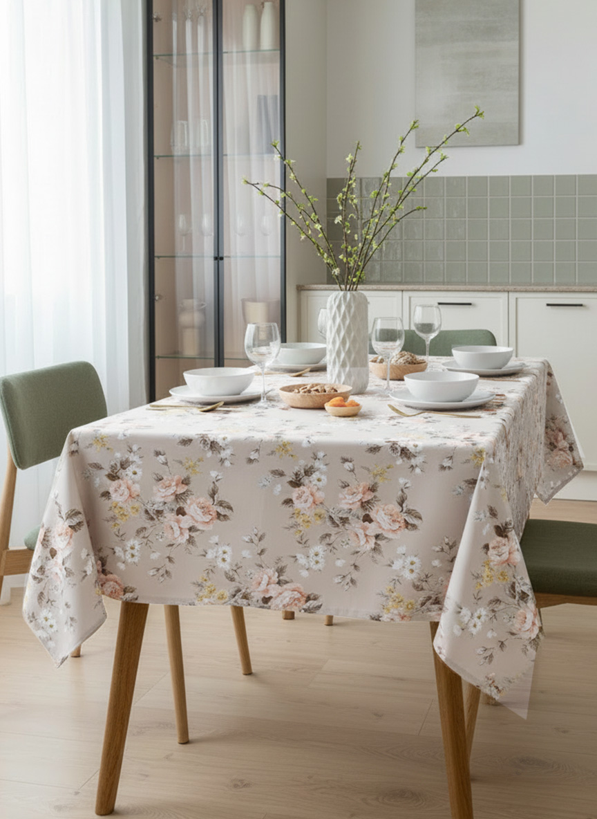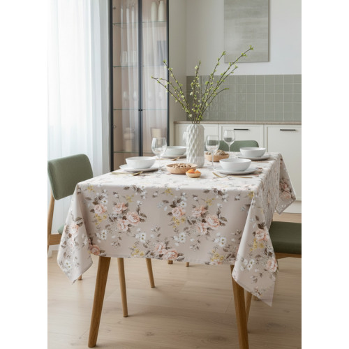 Скатерть Нежный букет габардин серо-бежевый оранжевый