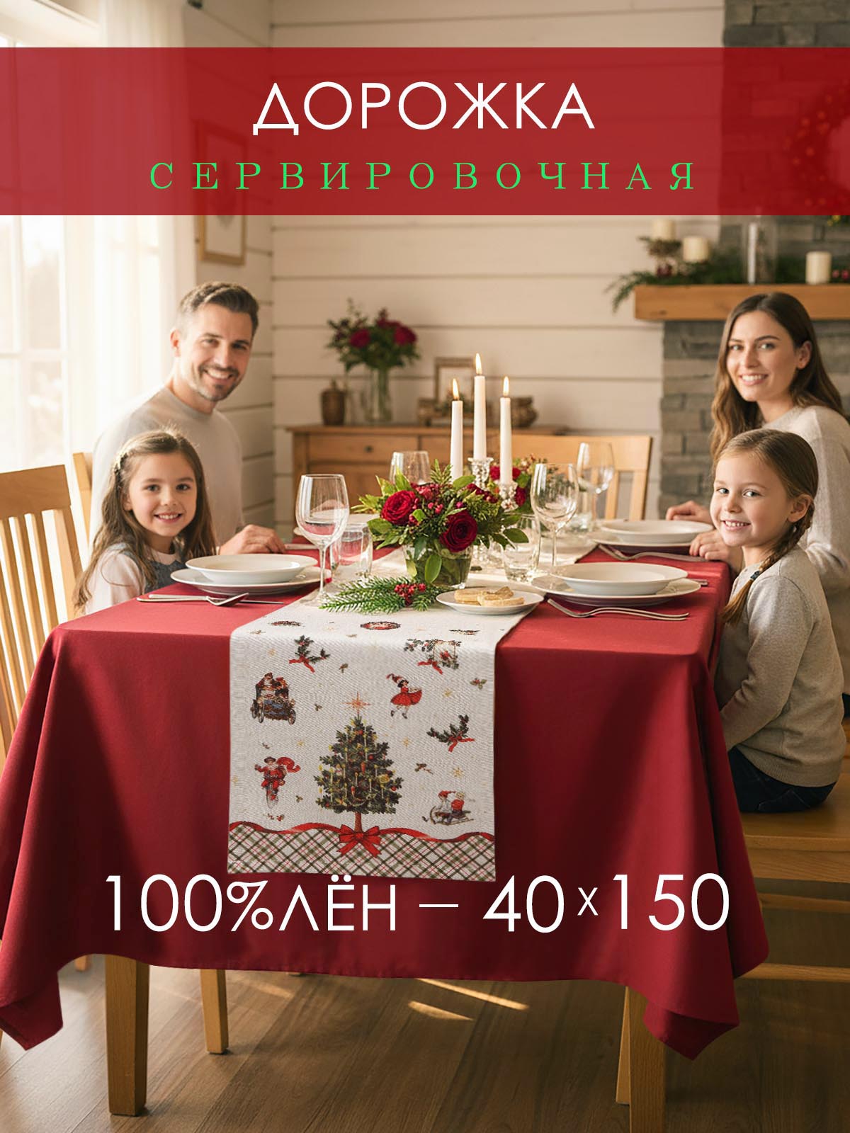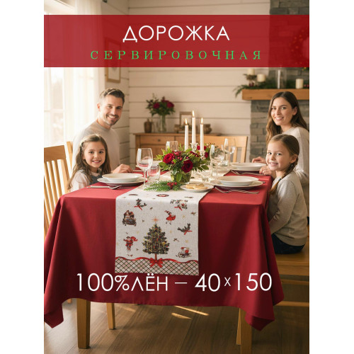 Дорожка декоративная Елка со свечами лен серо-бежевый