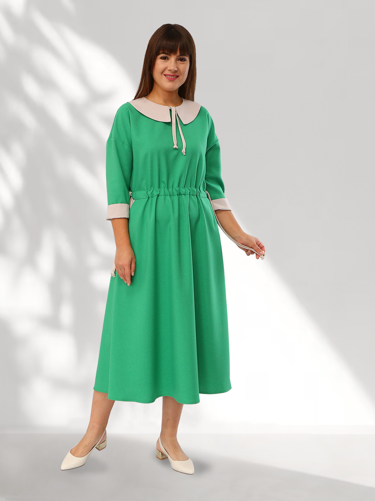 Это платье предназначено для активной современной женщины. Силуэт платья довольно свободный и женственный, регулируемая кулиска подчёркивает талию. Съёмный воротничок контрастного цвета придаёт романтичности Вашему образу. У платья имеются комфортные карманы, отвороты на рукавах позволяют регулировать их длину. Элегантное женское платье - идеальный вариант для любых событий будь то летняя прогулка, рабочий день в офисе или лекции в университете. Сочетание легкости и изысканности делает его идеальным вариантом, как для повседневной носки, так и для особых случаев – выход с подругами в кафе или в театр. Длинное платье миди придаст Вам женственности и шарма, а силуэт подчеркнет все Ваши достоинства. Платье подходит для любого типа женской фигуры. Платье доступно в различных цветах, что позволяет подобрать подходящий вариант под любой гардероб и настроение. Это платье может стать основой для создания множества образов, более строгий вид платья, без воротника и контрастных отворотов, позволит Вам использовать разн