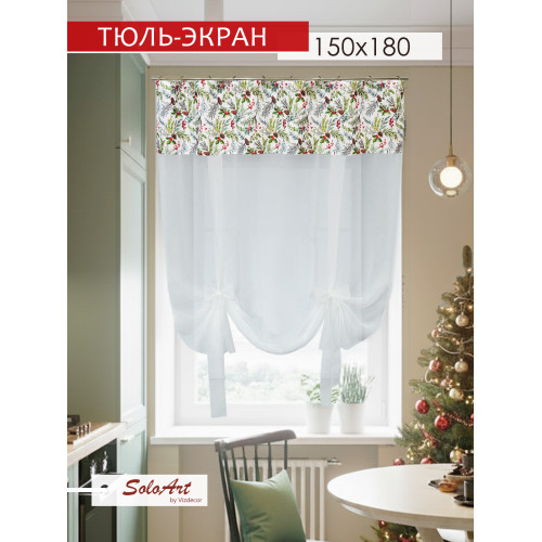 Тюль экран на кухню короткая на манжете ТМ SoloArt by Vizdecor. Тюль для кухни состоит из одного полотна размером 150 см (ширина) х 180 см (высота). Готовая штора экран сшита из матовой креп-вуали и манжета из габардина с принтом. С помощью лент можно отрегулировать любую высоту занавески или завязать ленты в виде шторы арки. Современные и модные шторы на кухню подойдут практически к любому интерьеру. Если Вы ищите необычные, модные интерьерные решения или тюль для кухни короткий, то австрийская штора будет оптимальным решением! Комбинированная тюль вуаль будет красиво смотреться в спальне, детской комнате, в зале или гостиной. Шикарно украсит окно в городской квартире, загородном или частном доме, а также будет идеально смотрется на даче. Готовые занавески на кухню будут служить не только украшением, но и практичной деталью интерьера, защищая помещение от солнца. Штора на кухню короткая придаст помещению элегантность и воздушность. Тюль экран на шторной ленте.