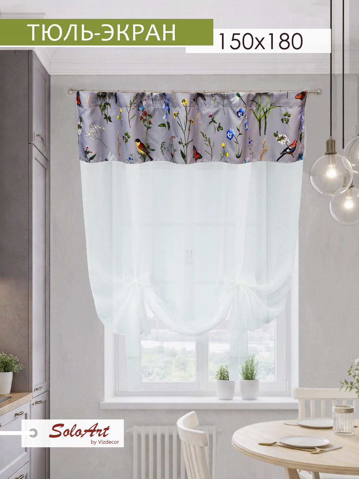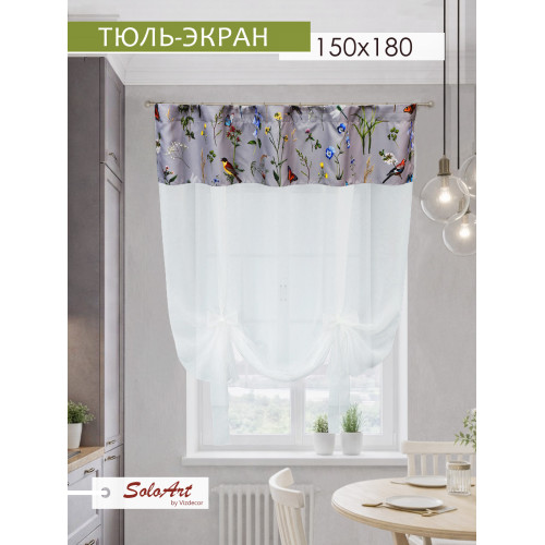 Тюль экран на кухню короткая на манжете ТМ SoloArt by Vizdecor. Тюль для кухни состоит из одного полотна размером 150 см (ширина) х 180 см (высота). Готовая штора экран сшита из матовой креп-вуали и манжета из габардина с принтом. С помощью лент можно отрегулировать любую высоту занавески или завязать ленты в виде шторы арки. Современные и модные шторы на кухню подойдут практически к любому интерьеру. Если Вы ищите необычные, модные интерьерные решения или тюль для кухни короткий, то австрийская штора будет оптимальным решением! Комбинированная тюль вуаль будет красиво смотреться в спальне, детской комнате, в зале или гостиной. Шикарно украсит окно в городской квартире, загородном или частном доме, а также будет идеально смотрется на даче. Готовые занавески на кухню будут служить не только украшением, но и практичной деталью интерьера, защищая помещение от солнца. Штора на кухню короткая придаст помещению элегантность и воздушность. Тюль экран на шторной ленте.