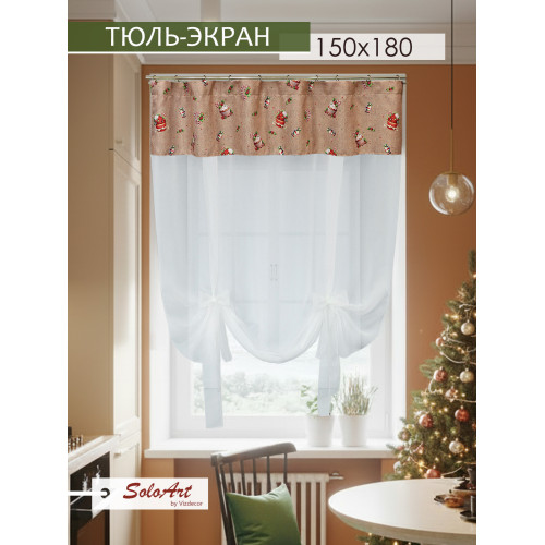 Тюль экран на кухню короткая на манжете ТМ SoloArt by Vizdecor. Тюль для кухни состоит из одного полотна размером 150 см (ширина) х 180 см (высота). Готовая штора экран сшита из матовой креп-вуали и манжета из габардина с принтом. С помощью лент можно отрегулировать любую высоту занавески или завязать ленты в виде шторы арки. Современные и модные шторы на кухню подойдут практически к любому интерьеру. Если Вы ищите необычные, модные интерьерные решения или тюль для кухни короткий, то австрийская штора будет оптимальным решением! Комбинированная тюль вуаль будет красиво смотреться в спальне, детской комнате, в зале или гостиной. Шикарно украсит окно в городской квартире, загородном или частном доме, а также будет идеально смотрется на даче. Готовые занавески на кухню будут служить не только украшением, но и практичной деталью интерьера, защищая помещение от солнца. Штора на кухню короткая придаст помещению элегантность и воздушность. Тюль экран на шторной ленте.