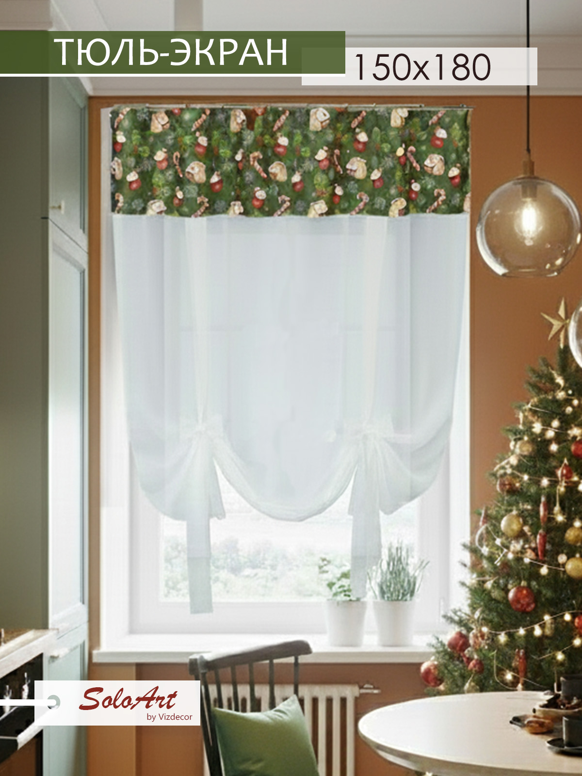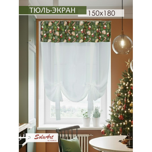 Тюль экран на кухню короткая на манжете ТМ SoloArt by Vizdecor. Тюль для кухни состоит из одного полотна размером 150 см (ширина) х 180 см (высота). Готовая штора экран сшита из матовой креп-вуали и манжета из габардина с принтом. С помощью лент можно отрегулировать любую высоту занавески или завязать ленты в виде шторы арки. Современные и модные шторы на кухню подойдут практически к любому интерьеру. Если Вы ищите необычные, модные интерьерные решения или тюль для кухни короткий, то австрийская штора будет оптимальным решением! Комбинированная тюль вуаль будет красиво смотреться в спальне, детской комнате, в зале или гостиной. Шикарно украсит окно в городской квартире, загородном или частном доме, а также будет идеально смотрется на даче. Готовые занавески на кухню будут служить не только украшением, но и практичной деталью интерьера, защищая помещение от солнца. Штора на кухню короткая придаст помещению элегантность и воздушность. Тюль экран на шторной ленте.