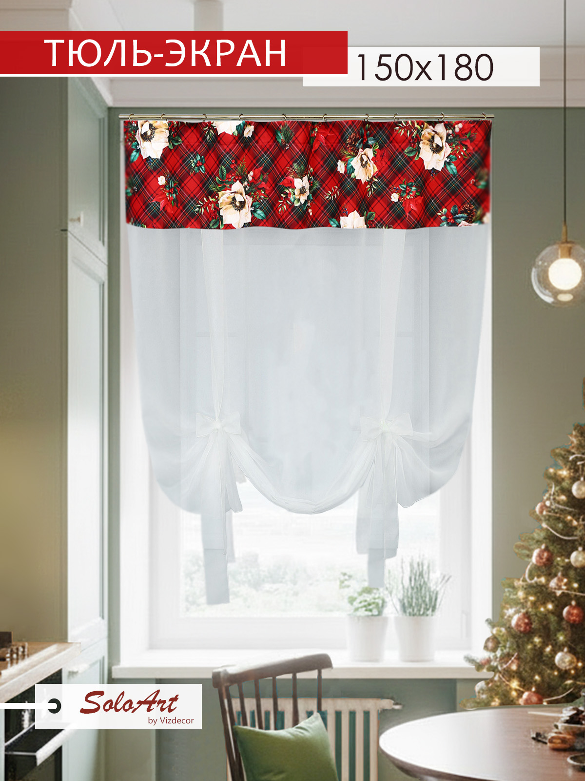 Тюль экран Шотландка габардин красный зеленый белый