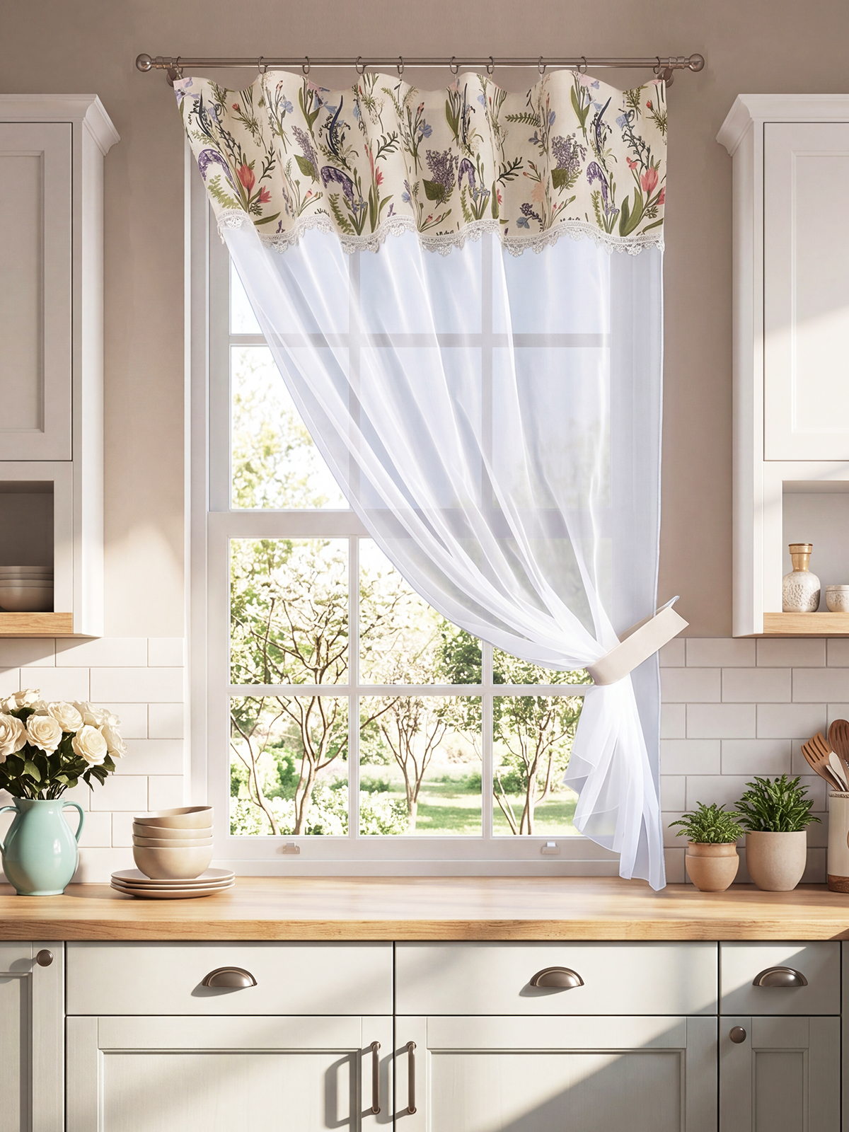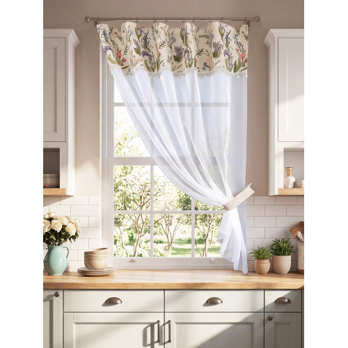 Тюль на манжете из хлопка Весенний букет белый молочный зеленый розовый