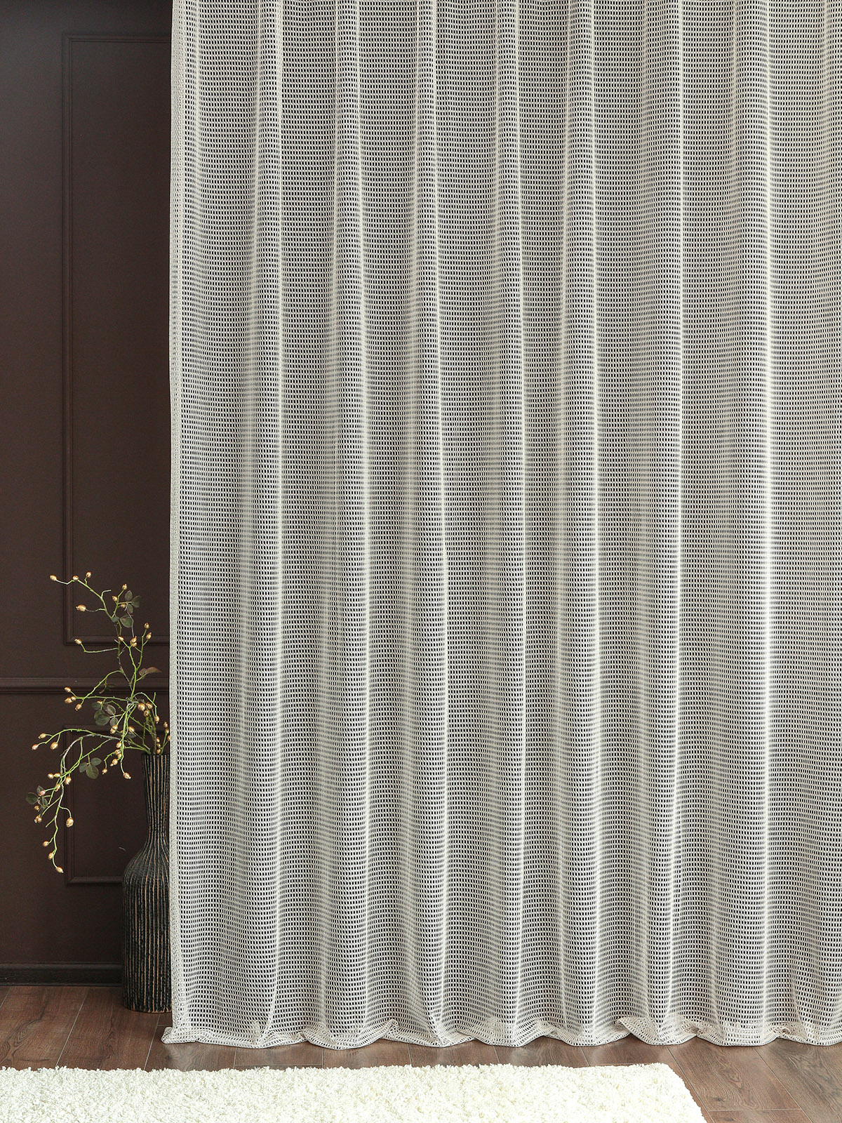 Оригинальный тюль сетка с крупным рисунком придаёт совершенно особенный шарм Вашему окну. Графический рисунок переплетения нитей создаёт современное и качественное полотно, которое не теряет привлекательного внешнего вида и формы в процессе использования. Легко гладится. Состав 100% полиэстер означает, что изделие устойчиво к ультрафиолету, не изменяет цвет, хорошо держит форму. Верх - на шторной ленте (тесьме), позволяющей регулировать ширину тюля и создавать красивые складки. Крепление на карниз при помощи шторной ленты, подходит для любого типа карниза. Рекомендуется деликатная ручная или машинная стирка при температуре воды 30 градусов. Во избежание потери формы, отжимать на низких оборотах, не выкручивать!