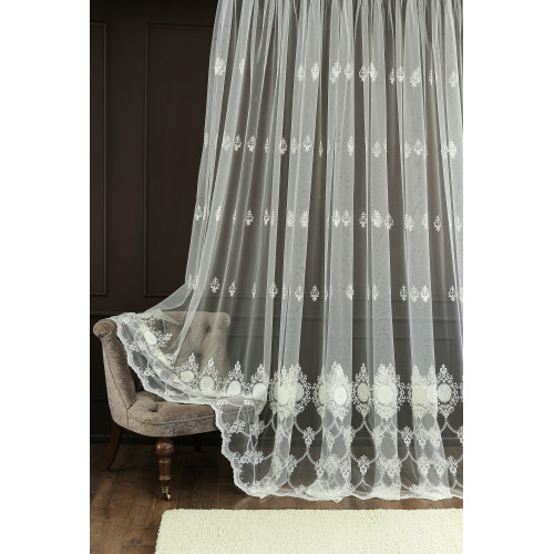 Никогда не выходящая из моды и всеми любимая тема - вышивка на сетке из фатина. Этот тюль привлекает нежностью рисунка, фактурой и цветом. Послужит прекрасным дополнением и к лёгким шторам, и к тяжёлым бархатны портьерам, а также к популярным сегодня шторам из блэкаута. Прекрасно впишется в шикарный классический интерьер, станет достойным украшением простого и уютного интерьера гостиной или спальни. Низ тюлевой шторы имеет красивый фестончатый край. Верх - на шторной тесьме(ленте). Для создания красивых складок необходимо стянуть тесьму до нужного размера. Крепление на карниз при помощи шторной ленты, подходит для любого типа карниза. Рекомендуется деликатная ручная или машинная стирка при температуре воды 30 градусов, во избежание деформации полотна не рекомендуется выкручивать, гладить в режиме "шёлк".